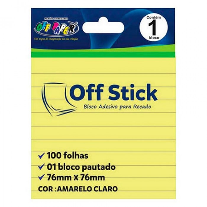 Bloco Adesivo Off Paper 76x76mm Amarelo PautadoAdesivo para recado Cola duradouraTamanho: 76x76mm