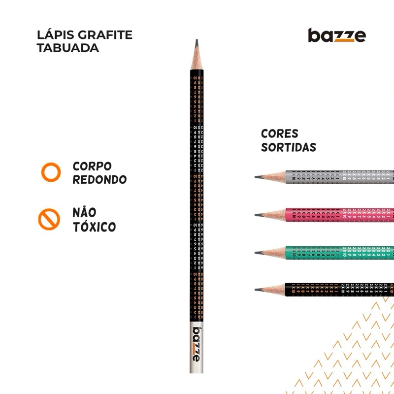 O Lápis Grafite HB Bazze Tabuada é ideal para estudantes que estão aprendendo matemática de forma divertida e prática. Cada lápis vem estampado com a tabuada, ajudando no aprendizado durante o uso no dia a dia. Com corpo redondo, garante conforto na escrita, além de possuir grafite HB que proporciona traços macios, resistentes e uniformes. É não tóxico, sendo seguro para crianças.