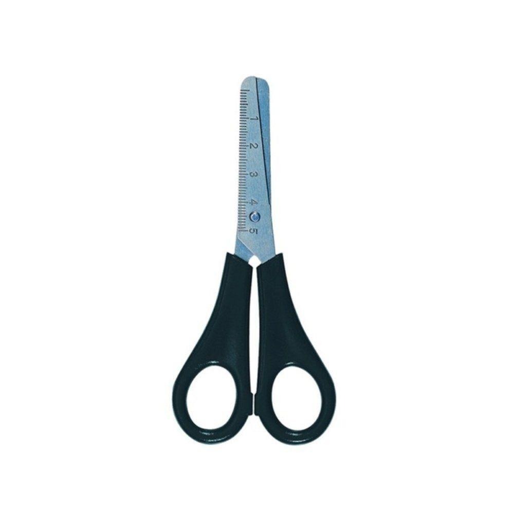 Tesoura escolar de 13cm, cabo plástico; Lamina inoxidável; Corpo com régua de 5cm. Cor preta Modelo Ks96